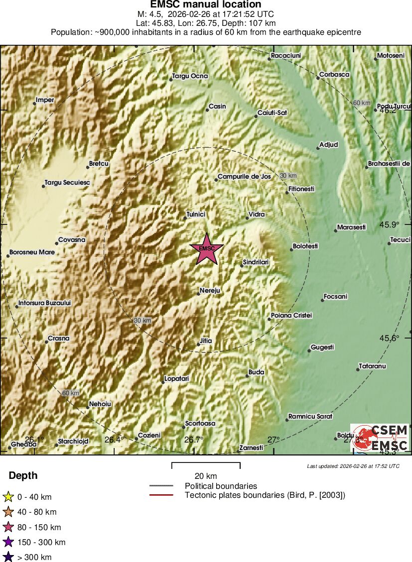Pe data de 26.02.2026, la orele 19:21:53, ora locală, 17:21:53 după GMT, de către rețeaua Națională de monitorizare Seismică a fost înregistrat un cutremur de pământ, cu magnitudinea de 4.4, a fost resimțit pe teritoriul Republicii Moldova cu intensitatea de 2 grade. Focarul a fost la adâncimea 107 km, conform datelor preventive.